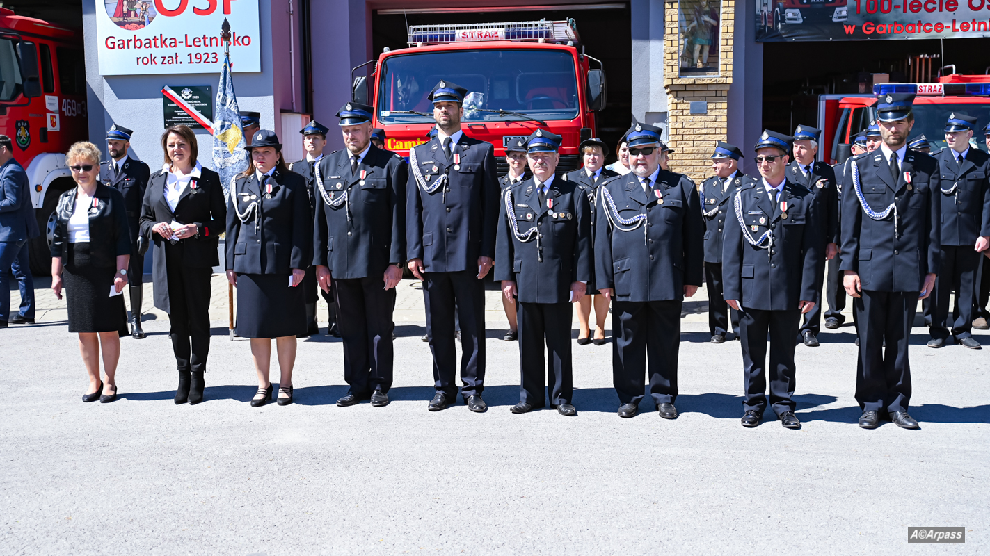 Po Mszy nastąpił przemarsz do siedziby OSP, gdzie na placu apelowym odbyła się dalsza część uroczystości, która rozpoczęła się od meldunku, wciągnięcia na maszt flagi państwowej i odśpiewania hymnu . Po oficjalnym powitaniu wszystkich zgromadzonych gości przez Wójta Teresę Fryszkiewicz, uczczono pamięć wszystkich zmarłych druhów z OSP Garbatka-Letnisko. Historię jednostki przybliżył Prezes Zarządu Oddziału Gminnego ZOSP RP Krzysztof Stalmach. Tak wspaniały jubileusz był również dobrą okazją do wręczenia medali, odznaczeń, okolicznych statuetek dla druhów i druhen oraz wszystkich zasłużonych na rzecz jednostki oraz przekazania i poświęcenia nowego pojazdu pożarniczego typu quad, a także odsłonięcia i poświęcenia tablicy upamiętniającej 100-lecie istnienia OSP Garbatka-Letnisko.