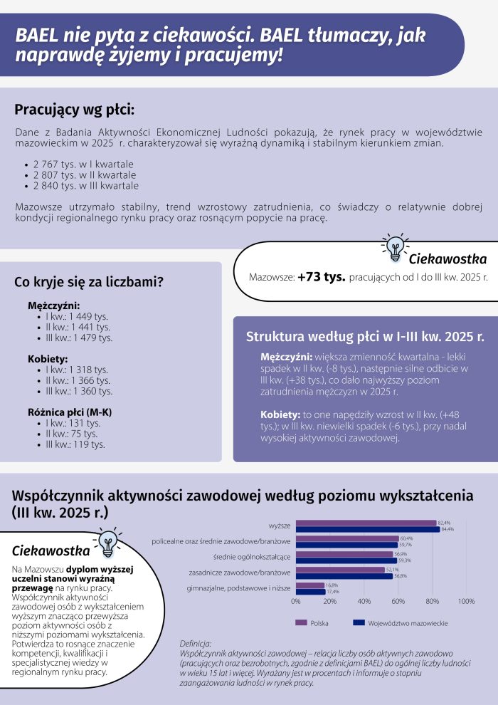 Urząd Statystyczny w Warszawie prowadzi Badanie Aktywności Ekonomicznej Ludności (BAEL). Jest to jedno z głównych badań ankietowych przeprowadzanych przez urzędy statystyczne i jedno z trzech badań obywateli Polski, które są prowadzone przez cały rok. W badaniu uczestniczą mieszkańcy Polski w wieku 15 lat i więcej, którzy zamieszkują wylosowane gospodarstwa domowe.