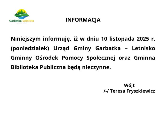 • Informacja ws. pracy Urzędu Gminy w dniu 10 listopada 2025 r.