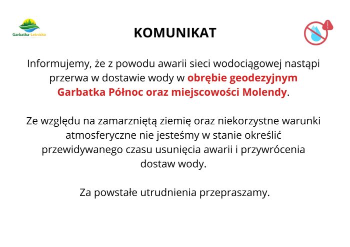 Aktualizacja: Awaria została usunięta, a dostawy wody przywrócone.