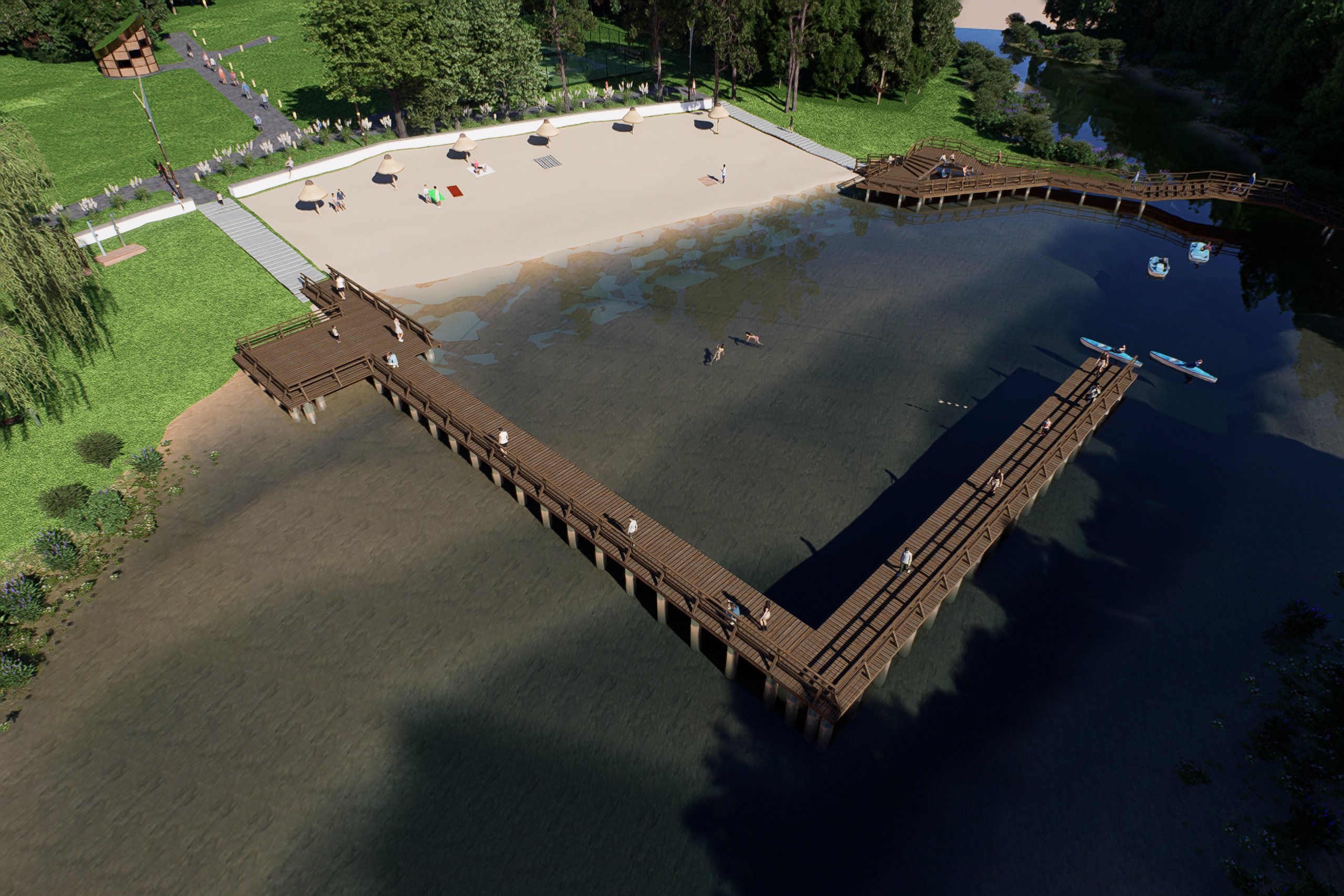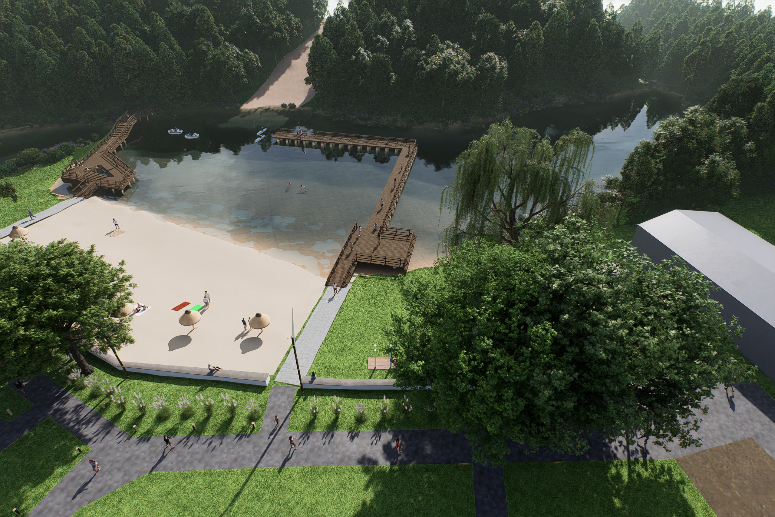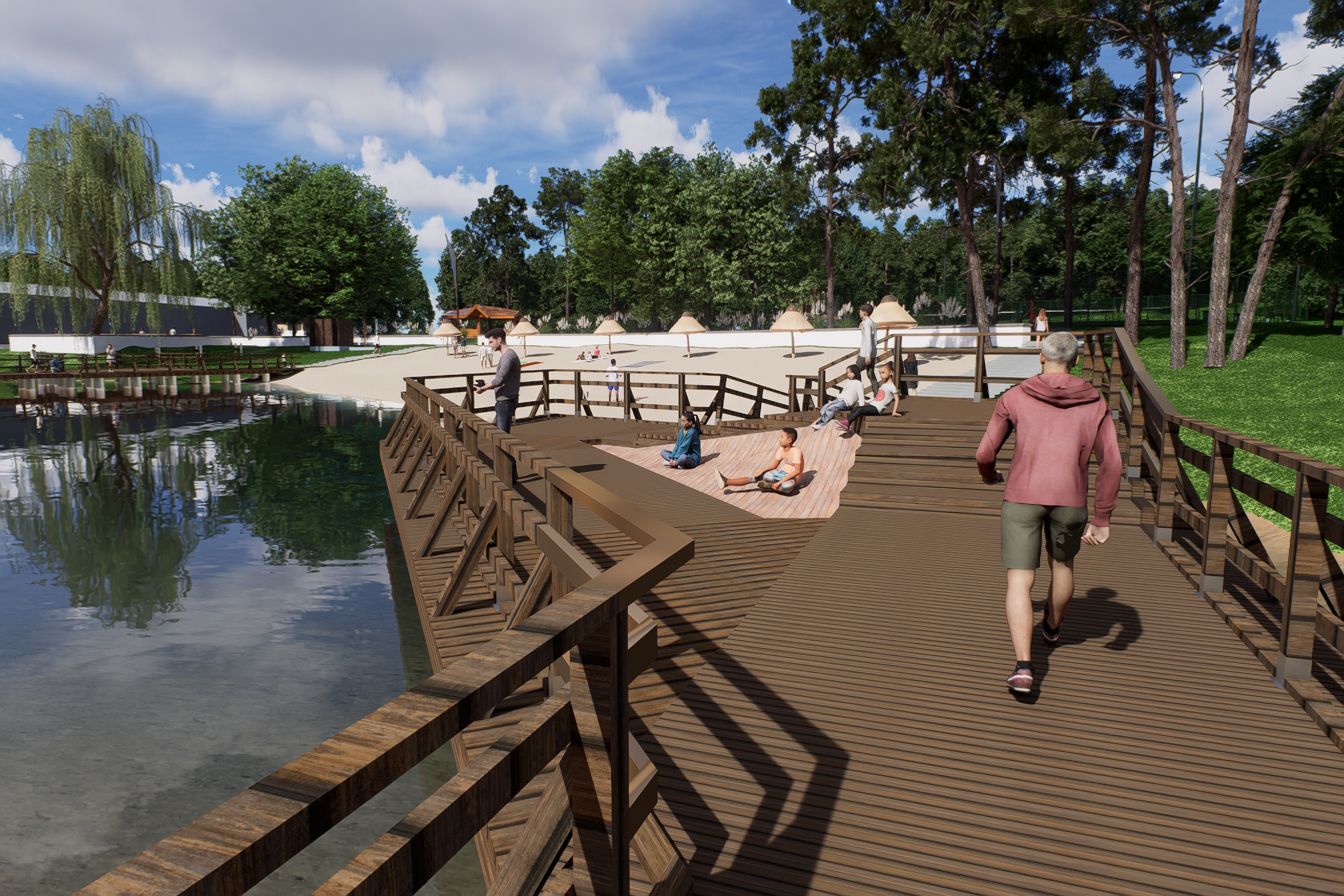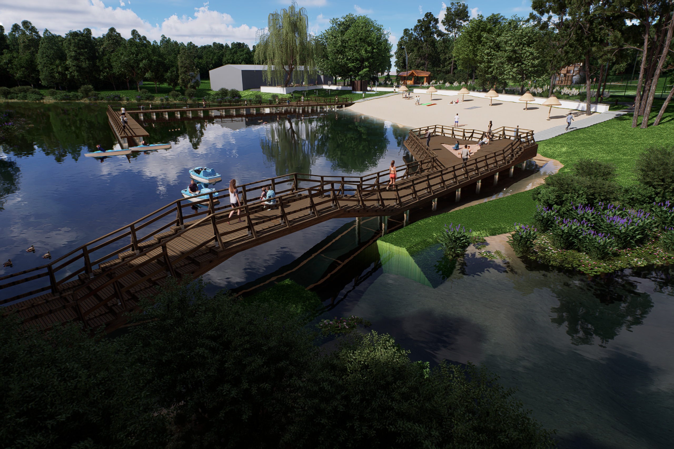Wizualizacja efektów prac końcowych robią wrażenie. Przebudowane zostaną tamy, w związku z czym podniesie się lustro wody i zmieni się linia brzegowa. Odmienione oblicze zyskają również plaża, amfiteatr oraz plac zabaw. Pojawią się nowe chodniki, oświetlenie oraz tężnia. Więcej niż słowa powiedzą jednak zdjęcia. Oto wizualizacja Polanki po pracach modernizacyjnych.