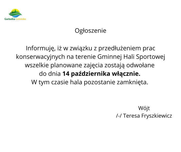 • Ogłoszenie: Gminna Hala Sportowa pozostaje zamknięta